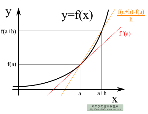 微分係数の\( \displaystyle f'(a) = \lim_{h \to 0 } \frac{f(a+h)-f(a)}{h} \)の図形的意味を考えてみる。